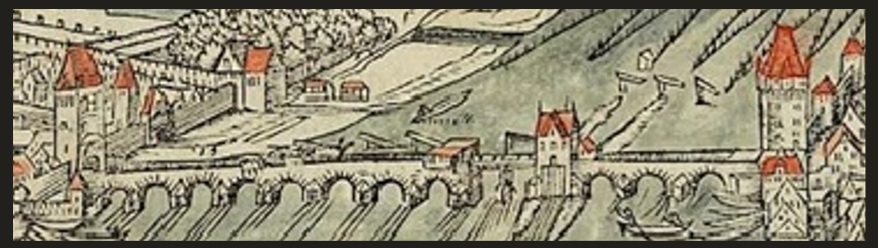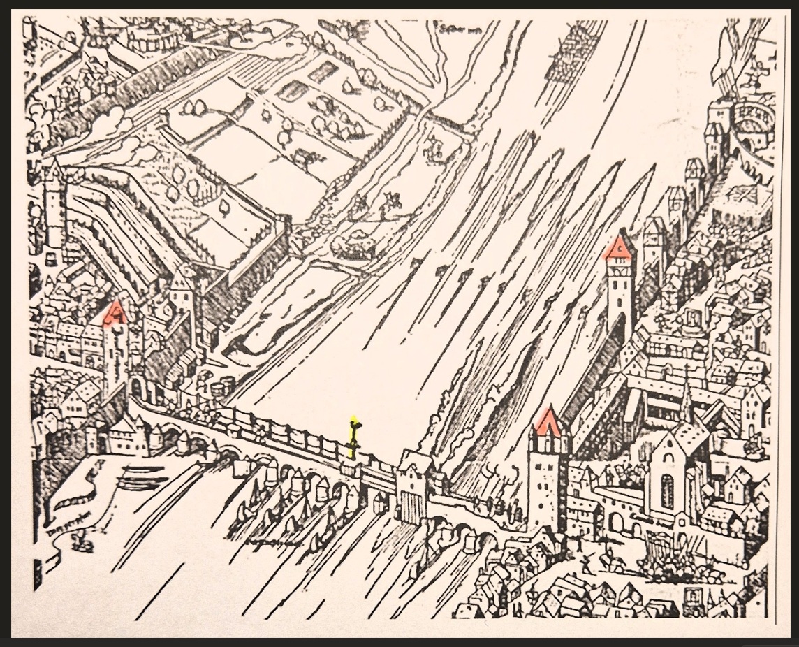 Wegen der Südwest-Nordost Ausrichtung der meisten Pläne, sieht man zwar die Alte Brücke gut, wie oben auf dem Belagerungsplan, die Stockage bleibt aber schemenhaft. Bei Baggerarbeiten, die man 1899 an der neuen Fahrrinne vorgenommen hatte, war man auf mehr als 100 uralte, eisenbeschuhte Eichenpfähle gestoßen. Sofort wurde gemutmaßt, es müsse sie wohl um die Fundamente einer alten römischen Brücke handeln, die man eh schon lange bei Frankfurt vermutet habe. Die Stockage könne es unmöglich sein, hätten die Pfähle doch direkt vor dem Kuhhirtenturm gelegen und dieser sei wohl der alte Brückenturm gewesen. Dank seiner Nord-Süd Ausrichtung sieht man auf dem Hoffmann-Plan die alte Brücke fast aus der Vogelflugperspektive. Das ist bei der Brücke zwar nicht so schön, dafür sieht man aber die Stockagenreihen sehr gut und direkt vor dem Kuhhirtenturm, damals noch der "Elefant", befand sich eine zweite, von der man sich nach diesem Bild unten sehr gut vorstellen kann, dass sie aus eisenbewehrten Eichenpfählen bestanden haben könnte. Überprüfen kann man das heute leider nicht mehr, denn nachdem man solch einen Sensationsfund gemacht hatte, hat man die vollkommen schwarzen Pfähle am Ufer aufgestapelt und als Brennholz versteigert.