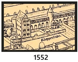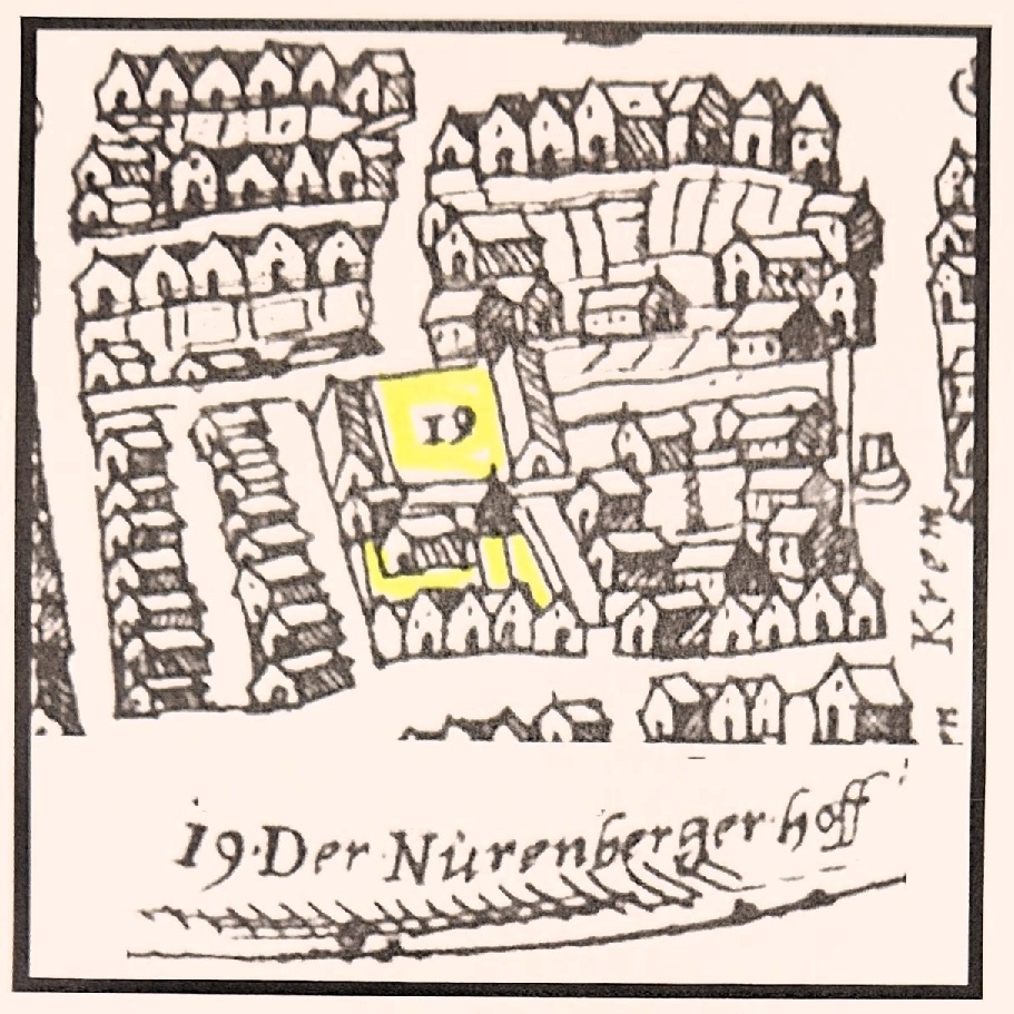 Ist auf dem Faber-Plan von 1549 der Nürnberger Hof, das große Messe-Quartier der Stadt, im Gewimmel der Altstadt noch nicht einmal zu erahnen, ist er auf dem Belagerungsplan von 1552 klar erkennbar und auf dem Hoffmann-Plan auch schon in der Legende vermerkt. Verständlich, hatte doch der Messehandel im 16.Jahrhundert einen deutlichen Aufschwung genommen.