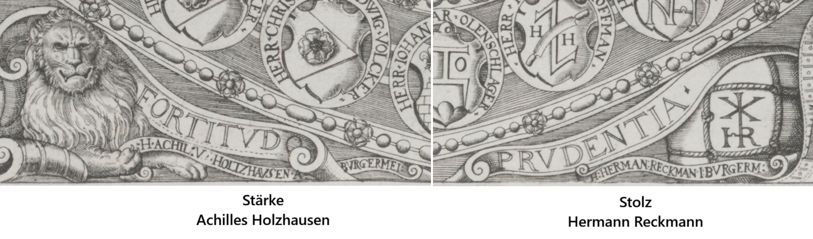 Zeichner der Druckvorlage, aus der ein Schnitzer dann einen hölzernen Druckstock gefertigt hat, war der Frankfurter Portraitmaler Konrad Faber, der mit seinem Erstlingswerk eine hochpräzise Ansicht Frankfurt lieferte. Faber allerdings musste auf die Bedarfe seines Schnitzers achten, der seine Zeichnung eins zu eins in das Birnbaumholz übertrug. Er hatte also nur eine Doppelseite Platz in diesem Almanach und musste sich einschränken. Den Plan oben habe ich aus diesem Werk abfotografiert, so dass dem Reichadler in der Mitte der Bindung die Hälse fehlen.