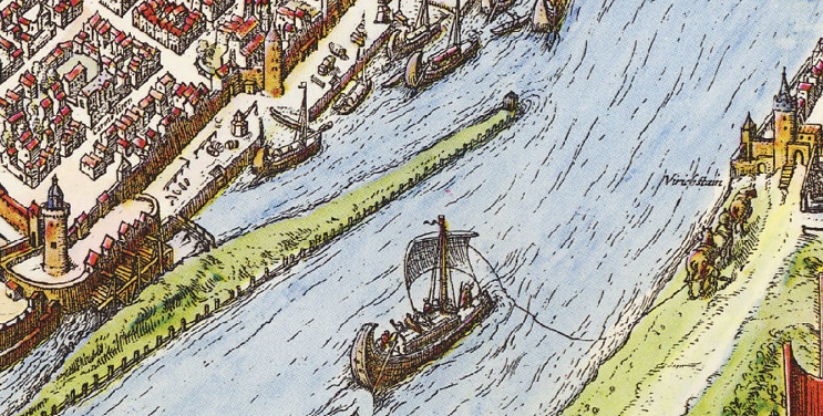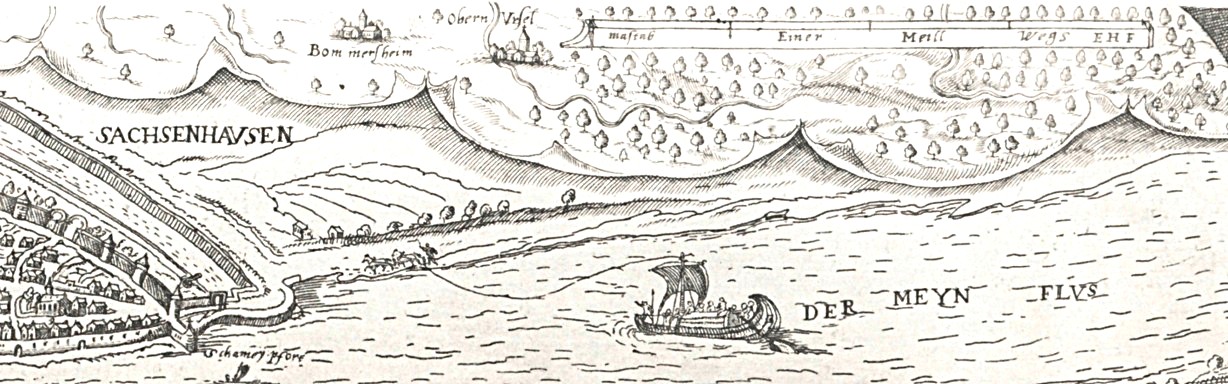 Oft wird bemerkt, über wieviel "dekoratives Beiwerk" diese frühen Pläne verfügen würden. Was bestimmt nicht unter Dekoration fällt, das ist das Marktschiff. Dieses verkehrte zwischen Frankfurt und Mainz und war jahrhundertelang die einzige täglich verkehrende Verbindung zwischen zwei Städten im ganzen Reich. Das war ein Pfund, mit dem man wuchern konnte und so sieht man auf allen frühen Frankfurt-Plänen, auch noch auf denen der Merians, das mit geblähten Segeln, von Pferden gezogene Marktschiff auf dem Main. die einzige Ausnahme macht da der Belagerungsplan, denn während der Kämpfe ist das Schiff nicht gefahren.