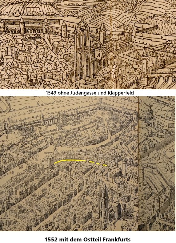 Mit dem Buchdruck, der Reformation und auch der Gegenreformation wurde immer mehr gedruckt und die Leute lernten Lesen und Schreiben und konnte vielleicht auch der Bäckergeselle nicht lesen, der Bäckermeister konnte das schon eher und ganz bestimmt der Kaufmann und auch viele Kaufmannssöhne und sogar auch viele der Kaufmannstöchter und diese neue Leserschicht lebte in Städten. Die Meisten waren zufrieden, ihren Bildungshunger über die Yellow-Press zu stillen, mit Einblatt-Drucken, auf denen sie informiert wurden über mit zwei Köpfen geborene Kälber, über am Himmel gesichtete Kometen, über Fürstenhochzeiten, Kriege und Mord und Tatschlag, nicht anders also, als heute. Wer es aber genauer wissen wollte, der kaufte sich einen Almanach und aus so einem Werk stammt auch der Stadtplan oben links. 1550 abgedruckt in einem der frühen dieser Werke, in Münsters Cosmographia, zeigt es die erste detaillierte Stadtansicht Frankfurts (und mehrere dutzend anderer Städte) überhaupt. In der - ansonsten identischen - Stadtansicht in der lateinischen Ausgabe findet man die Angabe "Frankfurt 1549".