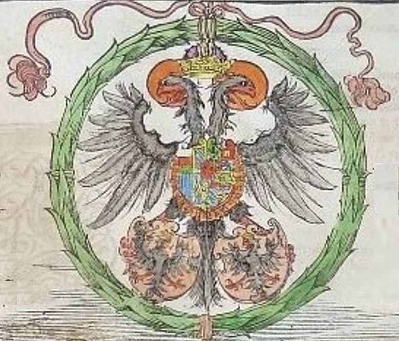 (eigentlich sollten die beiden Frankfurter Adler in den Klauen des doppelköpfigen Reichsadler weiß und nicht schwarz sein, sehen wir es dem zeitgenössischen Illustrator der bestimmt fernab von Frankfurt lebte nach)