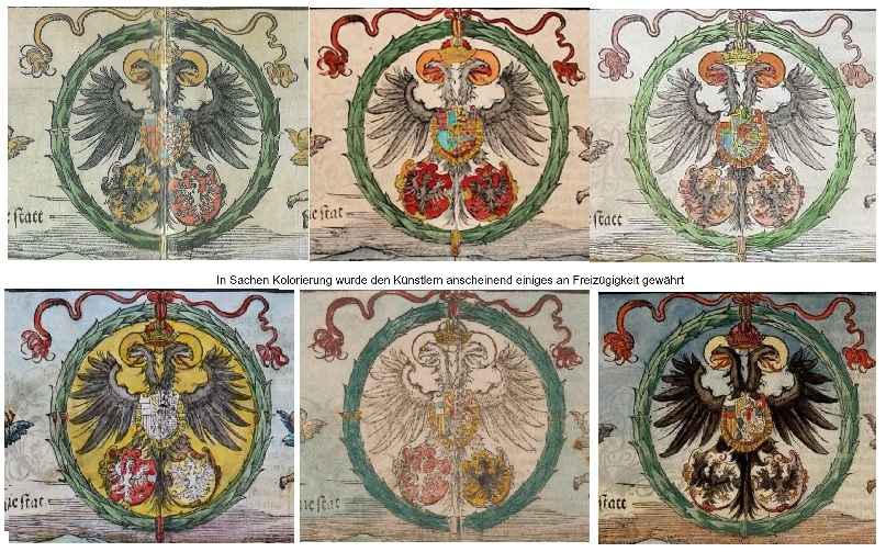 (eigentlich sollten die beiden Frankfurter Adler in den Klauen des doppelköpfigen Reichsadler weiß und nicht schwarz sein, sehen wir es dem zeitgenössischen Illustrator der bestimmt fernab von Frankfurt lebte nach)