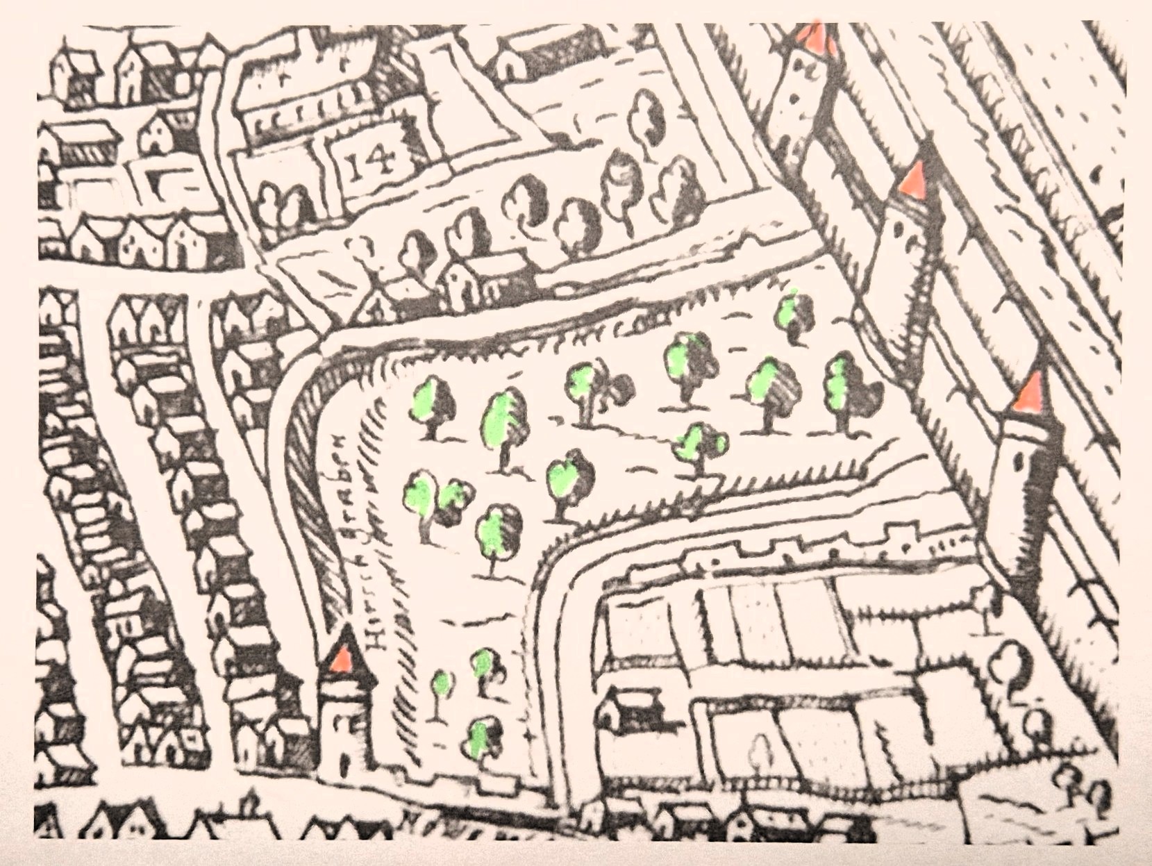 Der Hirschgraben auf den Plänen von 1549, 1552, 1572 und 1583