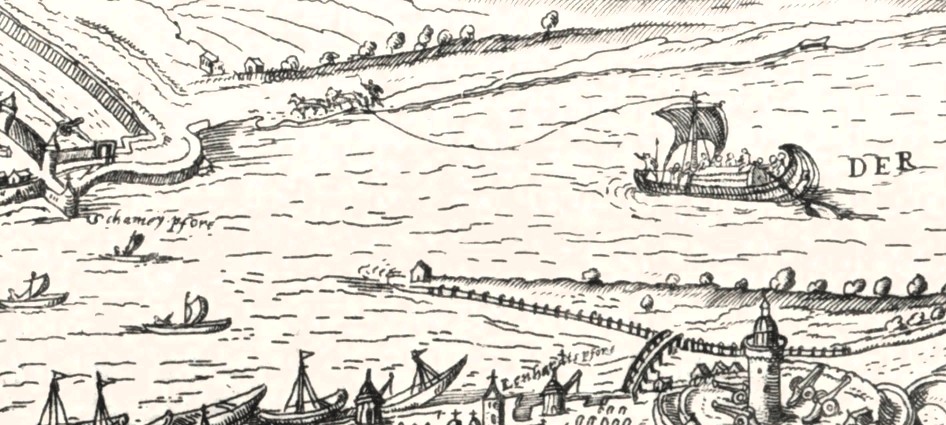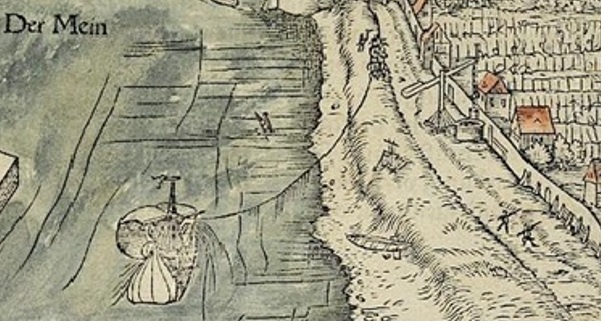 Oft wird bemerkt, über wieviel "dekoratives Beiwerk" diese frühen Pläne verfügen würden. Was bestimmt nicht unter Dekoration fällt, das ist das Marktschiff. Dieses verkehrte zwischen Frankfurt und Mainz und war jahrhundertelang die einzige täglich verkehrende Verbindung zwischen zwei Städten im ganzen Reich. Das war ein Pfund, mit dem man wuchern konnte und so sieht man auf allen frühen Frankfurt-Plänen, auch noch auf denen der Merians, das mit geblähten Segeln, von Pferden gezogene Marktschiff auf dem Main. die einzige Ausnahme macht da der Belagerungsplan, denn während der Kämpfe ist das Schiff nicht gefahren.