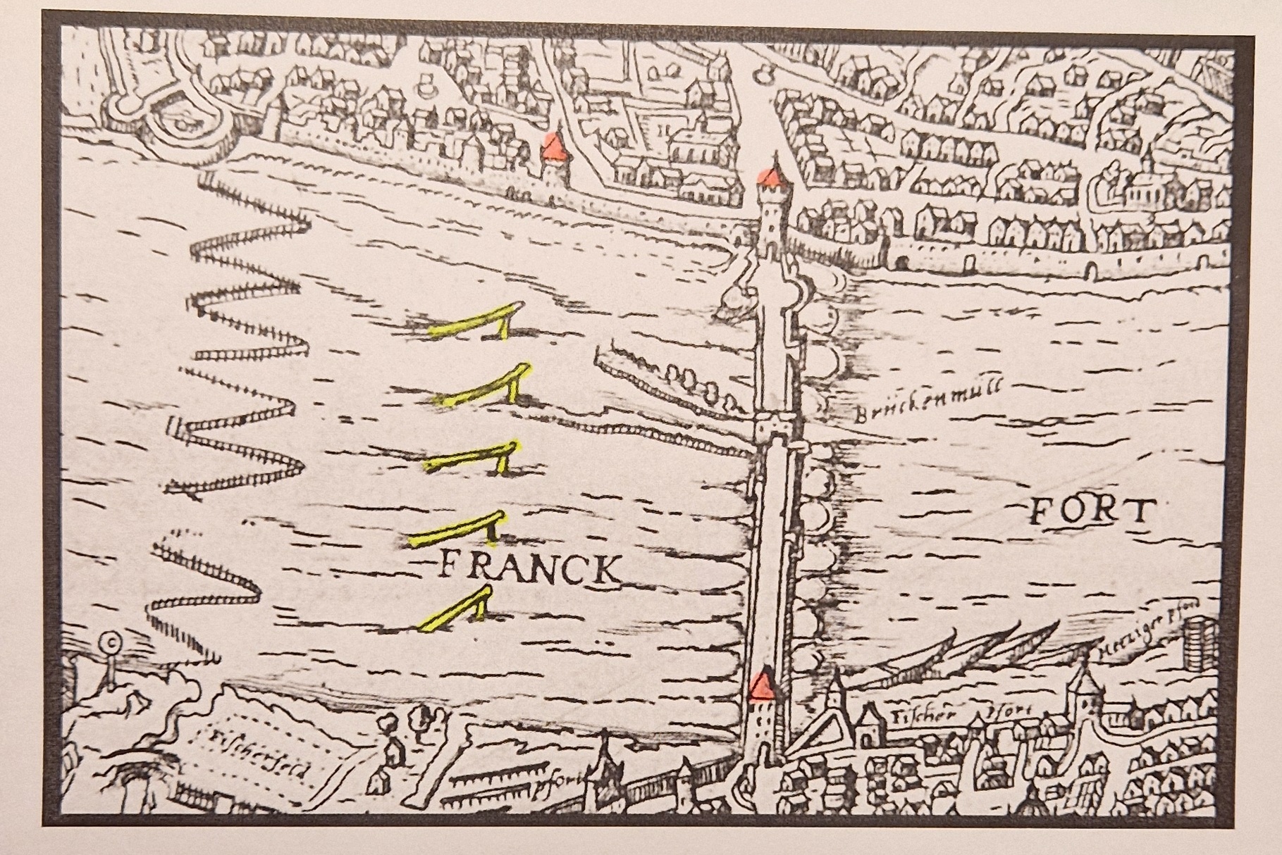 Wegen der Südwest-Nordost Ausrichtung der meisten Pläne, sieht man zwar die Alte Brücke gut, wie oben auf dem Belagerungsplan, die Stockage bleibt aber schemenhaft. Bei Baggerarbeiten, die man 1899 an der neuen Fahrrinne vorgenommen hatte, war man auf mehr als 100 uralte, eisenbeschuhte Eichenpfähle gestoßen. Sofort wurde gemutmaßt, es müsse sie wohl um die Fundamente einer alten römischen Brücke handeln, die man eh schon lange bei Frankfurt vermutet habe. Die Stockage könne es unmöglich sein, hätten die Pfähle doch direkt vor dem Kuhhirtenturm gelegen und dieser sei wohl der alte Brückenturm gewesen. Dank seiner Nord-Süd Ausrichtung sieht man auf dem Hoffmann-Plan die alte Brücke fast aus der Vogelflugperspektive. Das ist bei der Brücke zwar nicht so schön, dafür sieht man aber die Stockagenreihen sehr gut und direkt vor dem Kuhhirtenturm, damals noch der "Elefant", befand sich eine zweite, von der man sich nach diesem Bild unten sehr gut vorstellen kann, dass sie aus eisenbewehrten Eichenpfählen bestanden haben könnte. Überprüfen kann man das heute leider nicht mehr, denn nachdem man solch einen Sensationsfund gemacht hatte, hat man die vollkommen schwarzen Pfähle am Ufer aufgestapelt und als Brennholz versteigert.