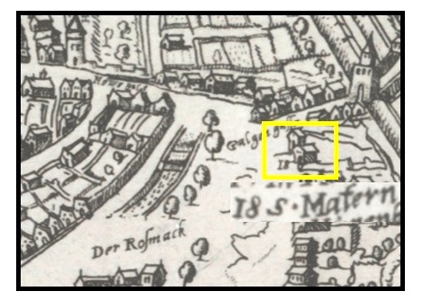Viel erstaunlicher, als dass der Nürnberger Hof auf einem Stadtplan Erwähnung findet, finde ich das Auftauchen der Sankt  Maternskapelle auf dem Roßmarkt in der Legende des Hoffmann-Plans - ein Kunststück, das dem unscheinbaren Kirchlein weder zuvor, noch danach gelungen ist. Nach der Reformation haben wohl noch nicht mal mehr Gottesdienste in ihr stattgefunden, genutzt wurde sie wohl nur noch als "Armesünderkapelle", Hinrichtungsdelinquenten erhielten hier ihr letztes Sakrament. Zu einiger Prominenz brachte es die Kapelle erst ca. 30 Jahre nach Erscheinen dieses Planes, als 1616 der Führer des nach ihm benannten Aufstandes, Vinzenz Fettmilch, die letzten Stunden vor seiner Hinrichtung in ihr verbrachte. Später diente sie noch als Wachtlokal für Soldaten und ist dann 1804 abgerissen worden. Was ihr also 1583 einen derart prominenten Platz auf einem Stadtplan einbrachte, ist mir unbekannt, vielleicht spielte sie irgend eine Rolle im Rahmen des Schützenfestes oder beim Zuzug der calvinistischen Glaubensflüchtlingen, aber wissen tue ich das nicht.
