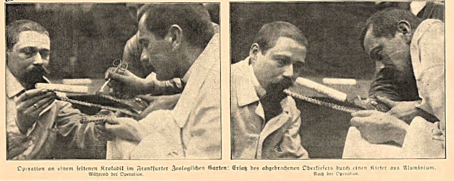 Schon vor Ausbruch des Krieges musste ein seltenes Ganges-Krokodil hier in Frankfurt fasten. Durch einen Unfall war ihm 1914 der halbe Oberkiefer abgebrochen und wurde ihm durch eine Aluminium-Prothese ersetzt.