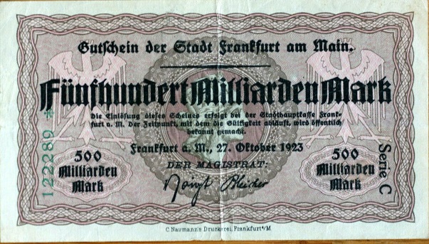 Und als zwei Tage später ein 500 Mrd-Schein herauskam war der noch richtig was wert, da kostete der Schoppen 2 Mrd Mark, man durfte das Geld aber nicht zu lange aufheben, denn bis Ende November 1923 stieg der Preis für ein Glas Apfelwein auf unglaubliche 200 Milliarden Mark.